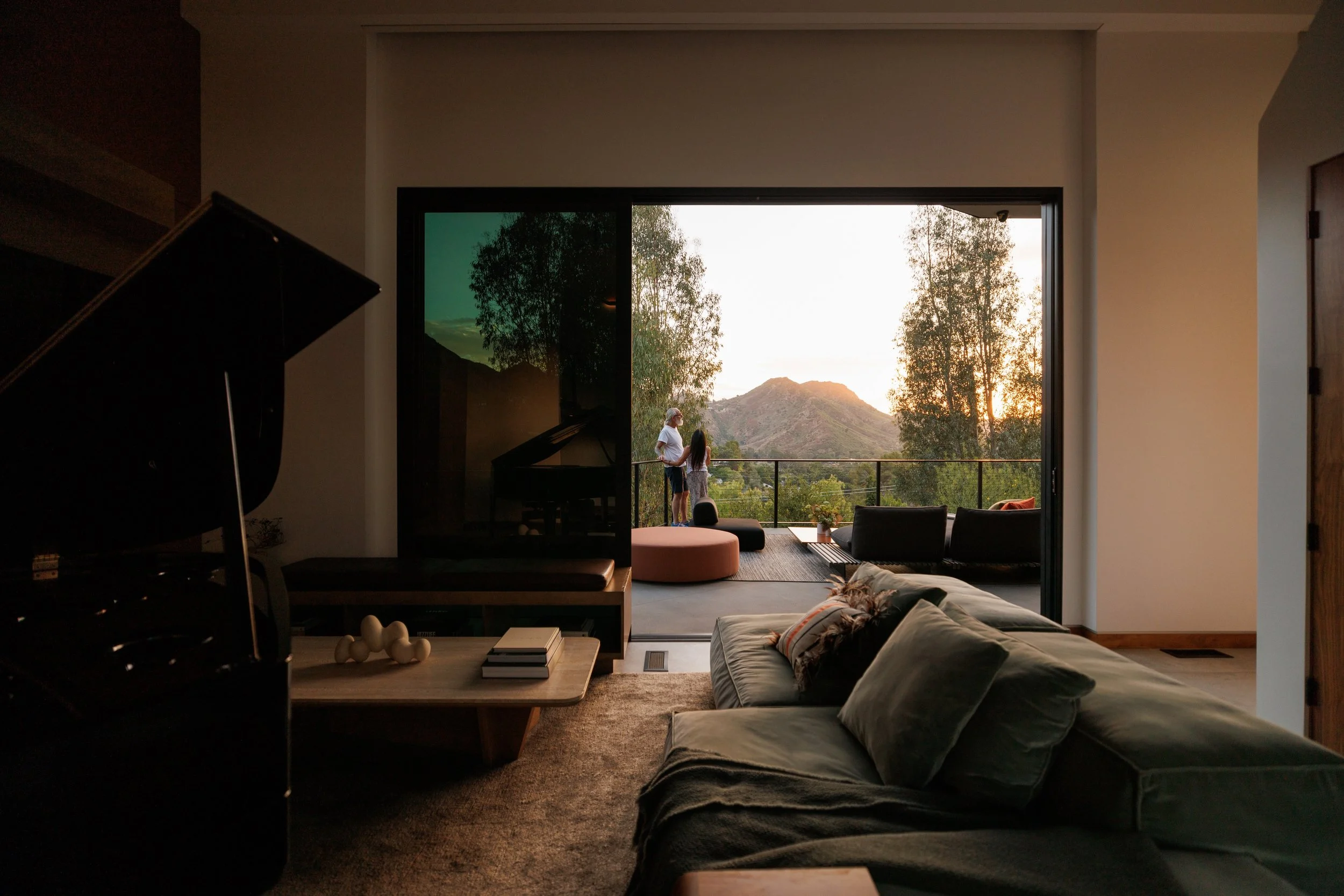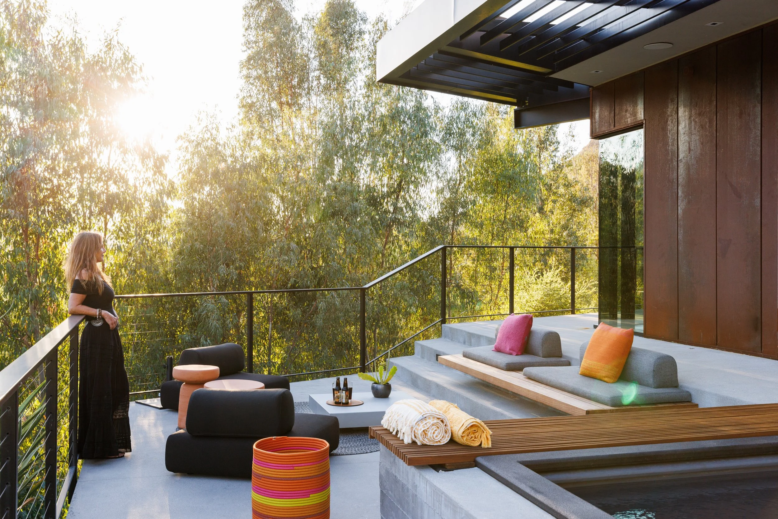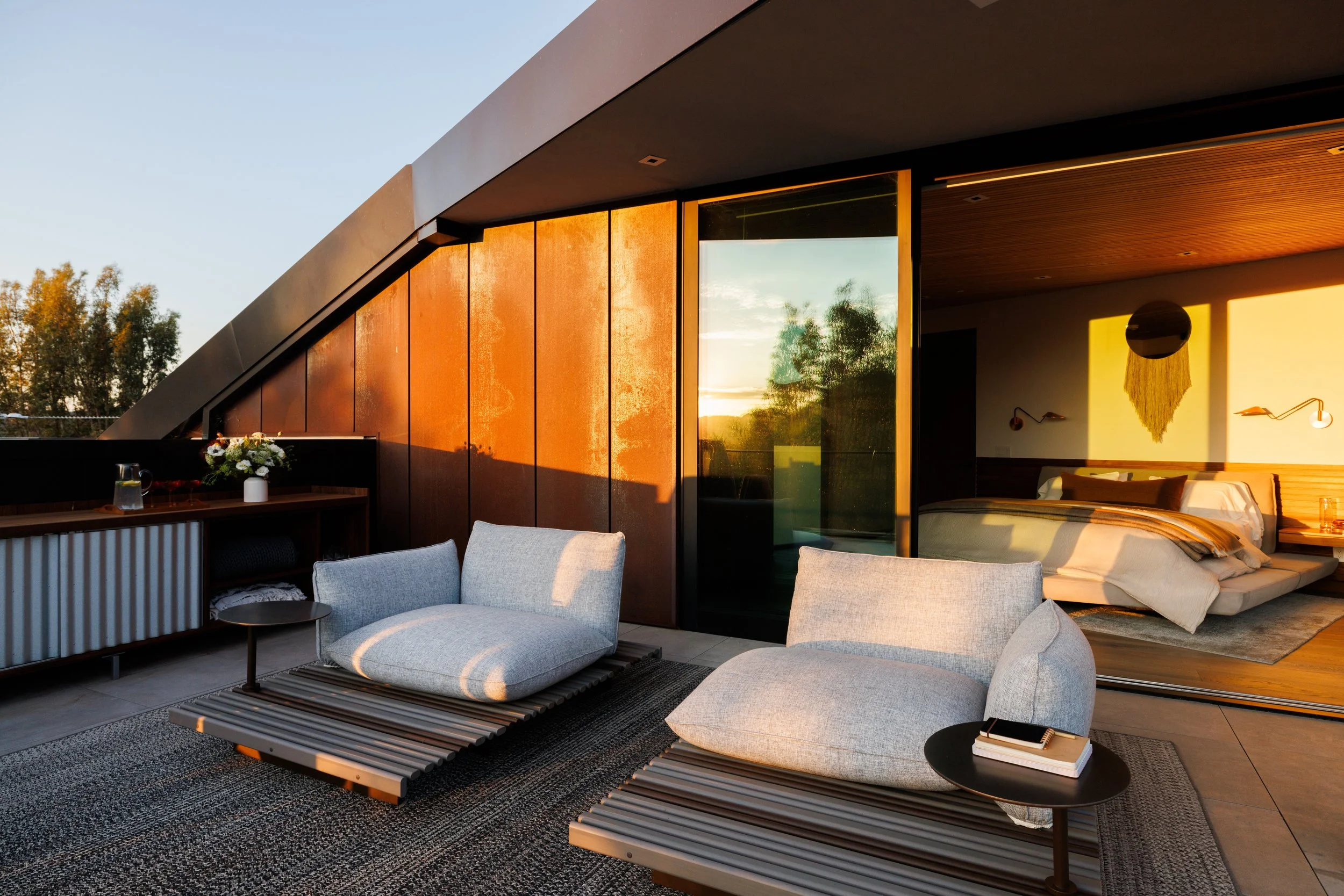 Goineau custom designed pieces to echo the architectural lines, from an outdoor credenza buffet with corrugated metal, to a coffee table that mirrors the structure’s angles. “The primary suite is absolutely stunning– private, elegant, refined and sexy,” Schireson says. “Sophie’s design of our custom bed incorporates the unusual shape of the bedroom and the view is incredible. The outdoor flow of furniture, color and design is spectacular.” Goineau adds, “From the materials and lines we used indoors, you feel completely connected to the earth from the surrounding rock and sedimentary layers of the land. The way the furniture fit together so seamlessly, and to be able to look beyond and out onto nature from just about anywhere you’re standing– it’s pure heaven.” Uninterrupted views at the entry point into the house set the stage for a spectacular flow from one space to the next, and also gave Goineau an opportunity to introduce softness, like the first thing you see in the living room– the Living Divani sage velvet sofa. “The house is all sharp angles and geometry, which was interesting when integrating furniture because you don’t want to contradict it. Instead of following the lines, we followed nature, and that is where the shapes came from.”