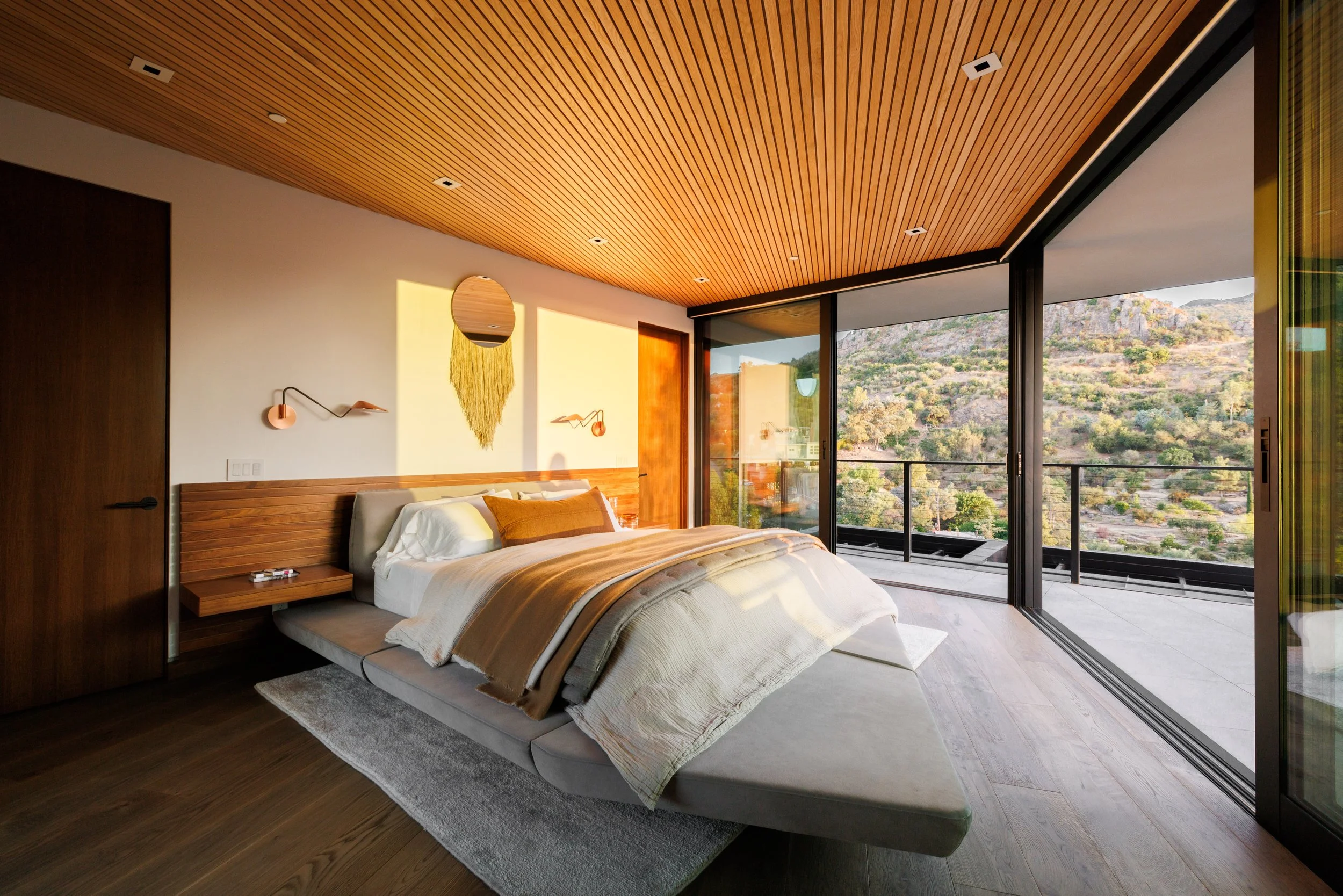 “The house is an exclamation point on the top of a mountain,” Goineau says. “With nature and beauty of this scope, you have no choice but to bow to it and honor it. We wanted to be attentive to the sensations provoked by the prominent landscape without losing the identity of the house and its inhabitants.” The designer created an environment that is deeply connected to the exterior and the earth, evoking the feeling of being outside while indoors. In a mastery of layering, the modernity is balanced by various wood elements and natural metal surfaces for an overall effect of warmth throughout. A high, plain white living room wall intended for the television was covered in floor-to-ceiling copper mirror, with a secondary layer of wood as a background. “It was my way of incorporating Mother Nature. We used that method as a template throughout for softening contrast into a soothing, neutral background.” Millwork was another way of including that natural softness, from wraparound banquettes, floor-to-ceiling wall paneling and cabinetry, to built-in bed surrounds. “I feel so blessed they let me bring in all these amazing manufacturers and companies like LaForma, who built all the millwork,” says Goineau.